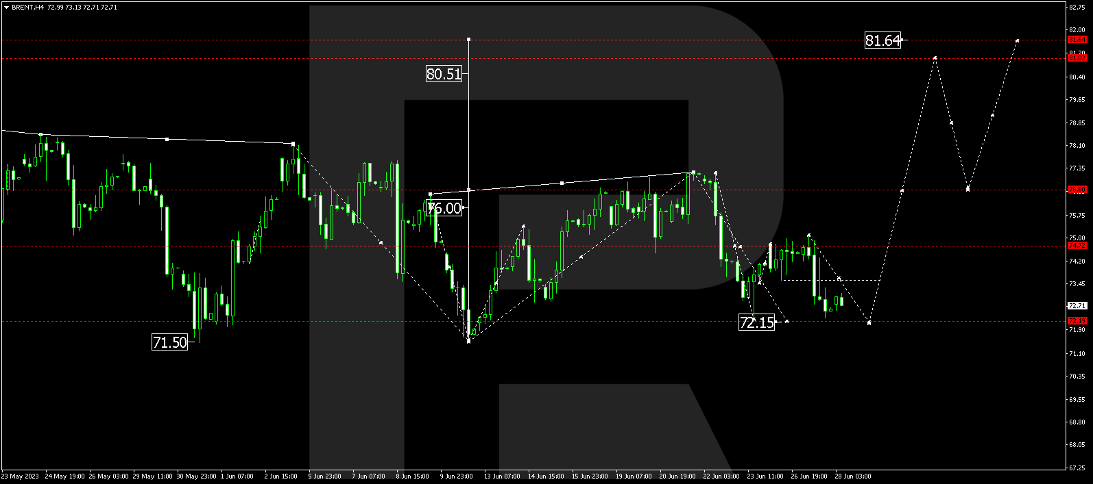 Brent continues developing a consolidation range around 74.74. The range might extend downwards to 72.15. With an escape from the range upwards, the potential for a structure of growth to 76.60 could open. And if this level also breaks upwards, a wave to 81.00 might develop from there.