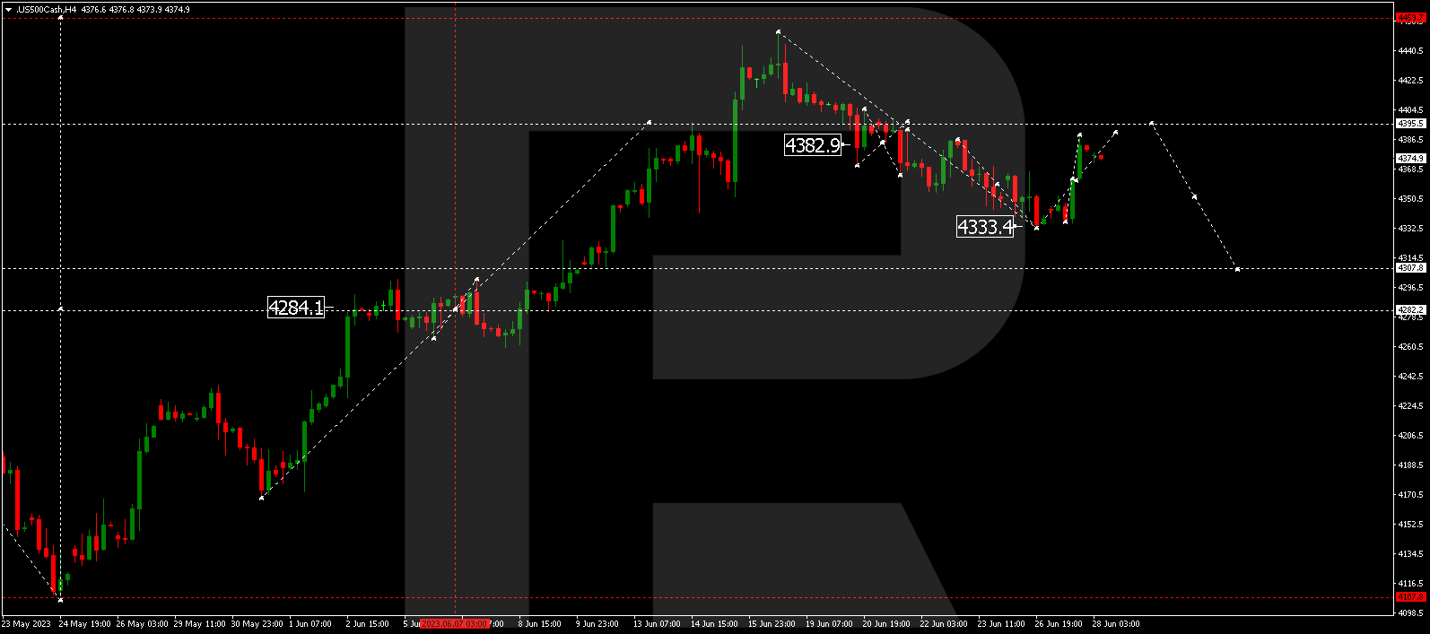 The stock index has completed a structure of a wave of decline to 4333.3. A correction might develop today to 4395.5, followed by a decline to 4282.0 (a test from above).