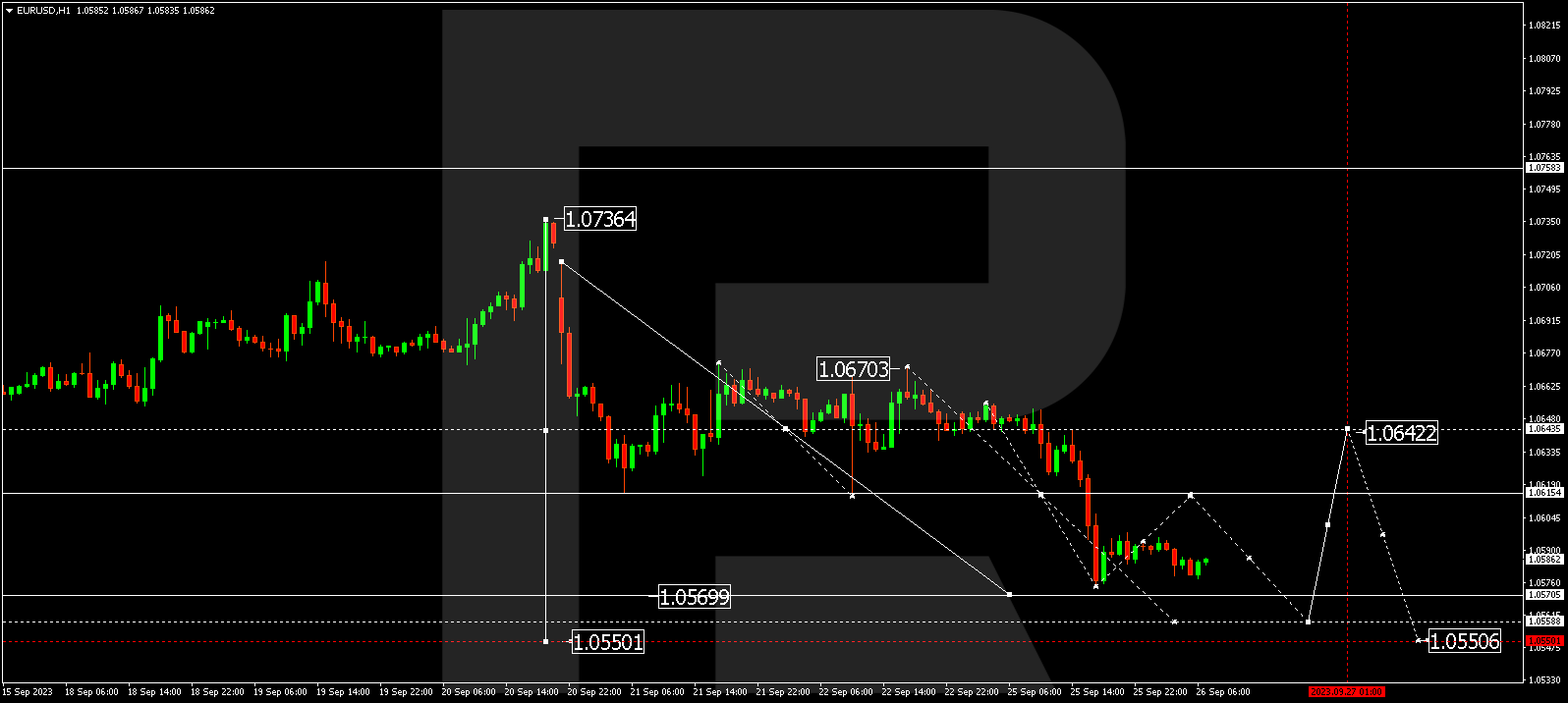 EUR/USD has completed a wave of decline to 1.0575. Today a consolidation range could develop above this level. A link of growth to 1.0616 (a test from below) is not excluded, followed by a decline to 1.0556 with the trend potentially continuing to 1.0550. This is the first target.