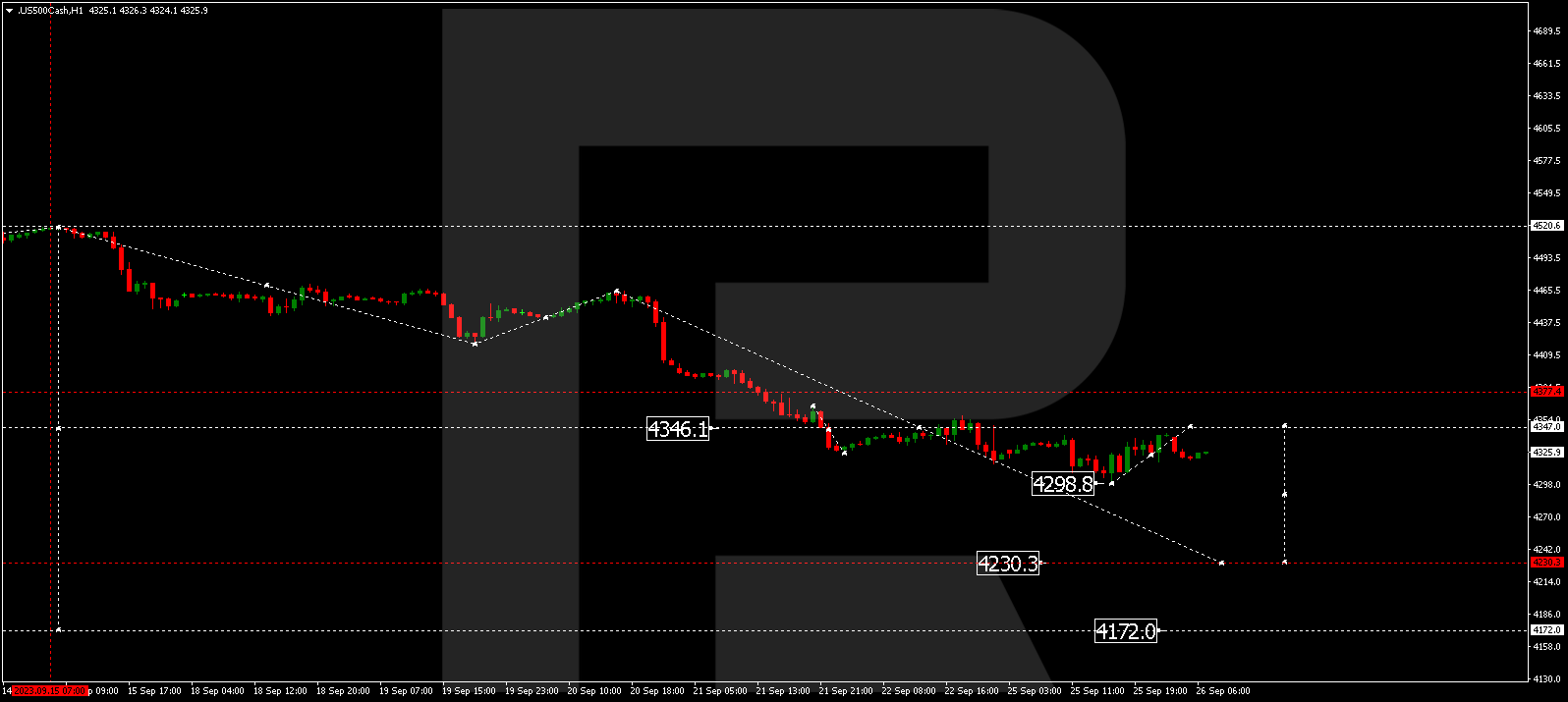 The stock index has completed a downward movement to 4298.8. A consolidation range could form above this level today. With an upward breakout, a link of correction to 4347.0 (a test from below) could form, followed by a decline to 4230.3. This is a local target. After reaching this level, the price could correct to 4298.0 and then fall to 4172.0. This is the first target.