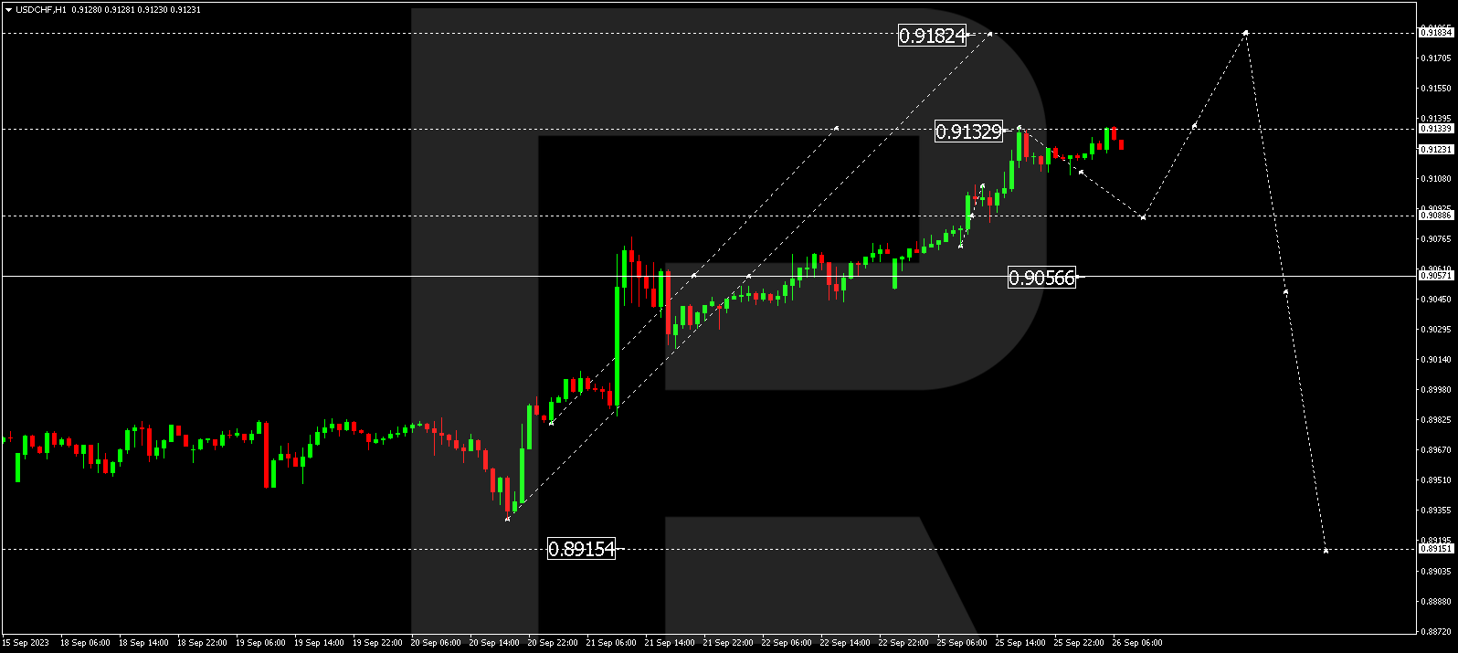 USD/CHF has completed a growth wave, reaching 0.9133. Today a consolidation range is expected to develop below this level. With a downward breakout, a link of correction to 0.9088 could follow. An upward breakout will open the potential for the trend to continue to 0.9184.