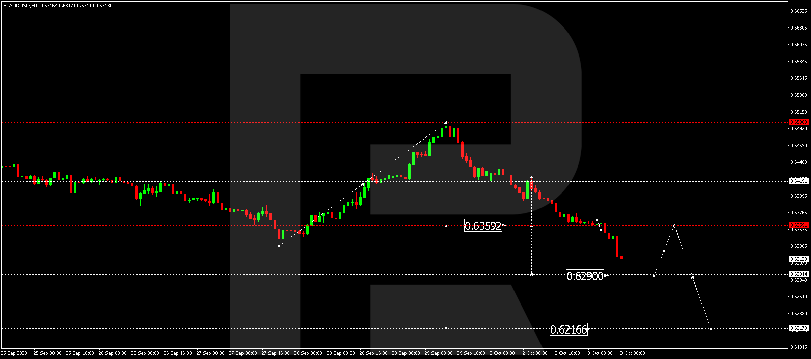 AUD/USD has completed a wave of decline to 0.6360. By now, a consolidation range has formed around this level, and the quotes continue developing the trend to 0.6290, escaping the range downwards, from where the trend could continue to 0.6216.