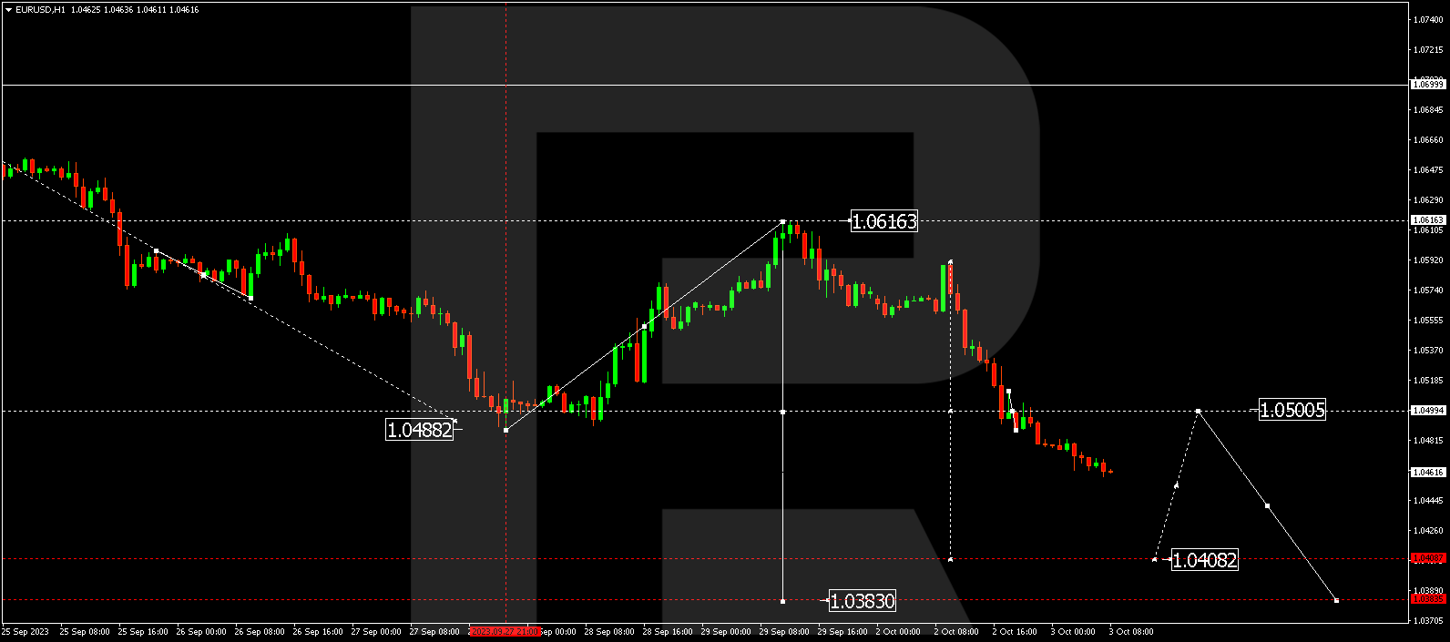EUR/USD has made a descending movement to 1.0500. By now, the market has formed a consolidation range and, escaping it downwards, continues developing the wave by the trend to 1.0408. Upon reaching this level, a link of correction to 1.0500 (with a test from below) is not excluded. Next, a decline to 1.0383 by the trend is expected. This is a local target.