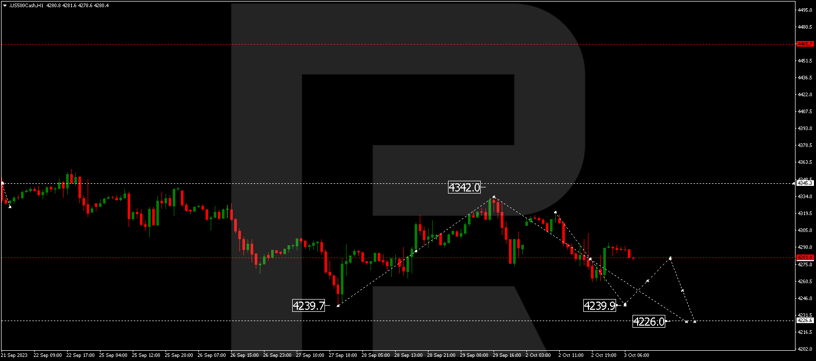 The stock index continues developing a consolidation range around 4280.0. With an escape downwards, the wave might extend to 4226.0. Next, a rise to 4280.0 might follow (with a test from below). And next, a decline to 4040.0 could happen. This is a local target.