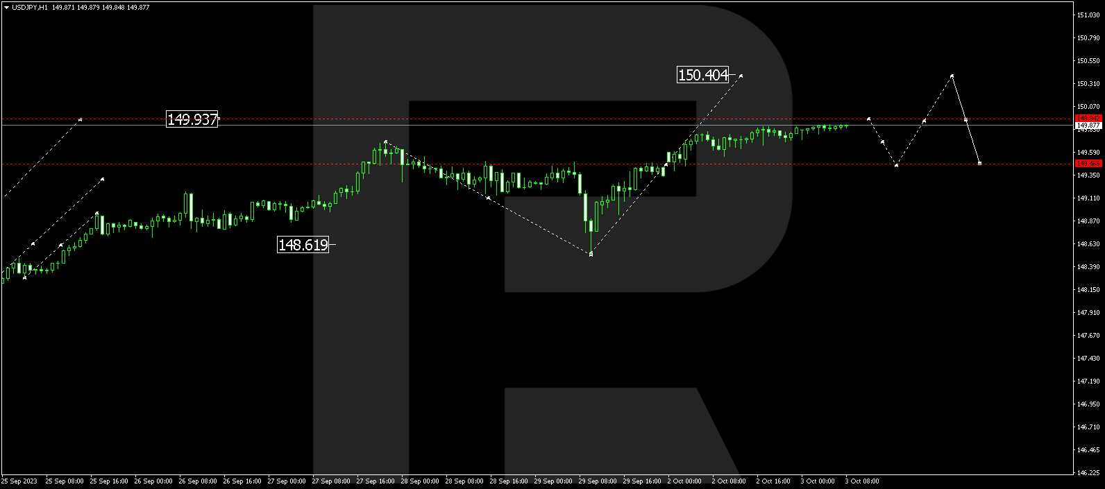 USD/JPY extends the wave of growth to 149.94. Next, a decline to 149.46 is expected. Practically, a consolidation range is forming around this level. With an escape upwards, the potential for a wave to 150.40 could open, from where the trend might continue to 150.90.