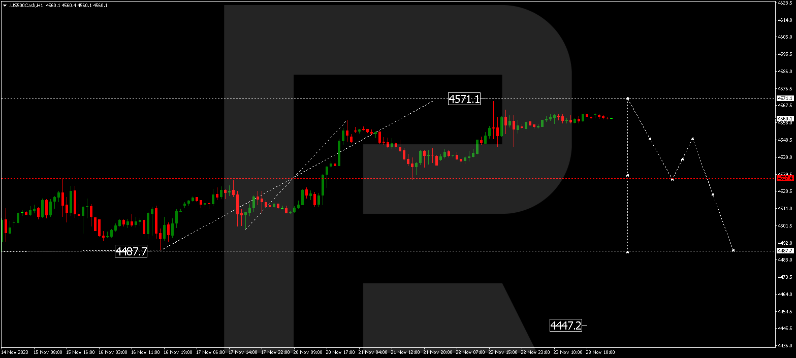 The stock index continues developing a consolidation range around 4530.0. A link of growth to 4571.0 is not excluded today. A new decline wave to 4487.0 might start then. This is the first target.