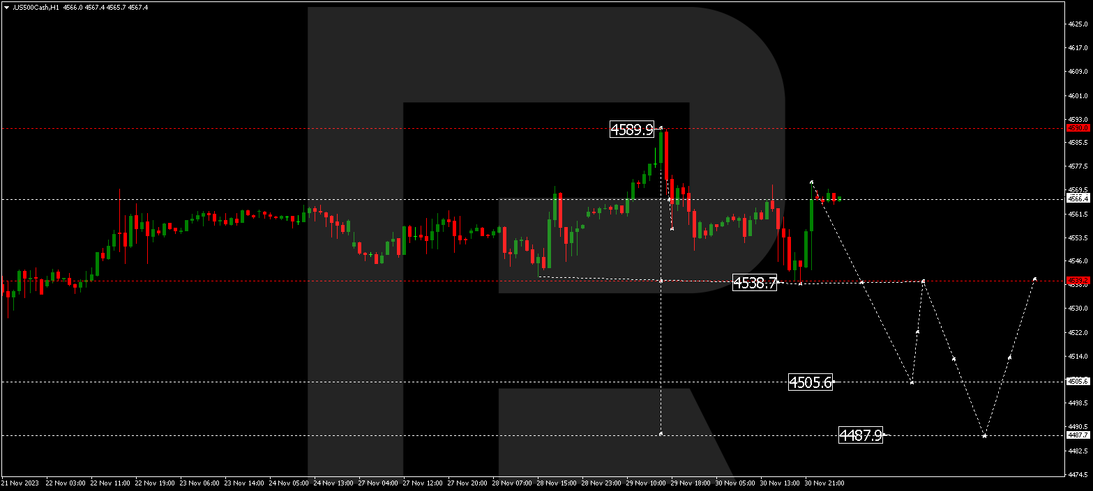 The stock index has completed a decline impulse to 4540.0. By now, it has corrected to 4566.6. A decline link to 4540.0 might form today. With a breakout of this level downwards, the potential for further development of the wave to 4505.5 could open. This is a local target.