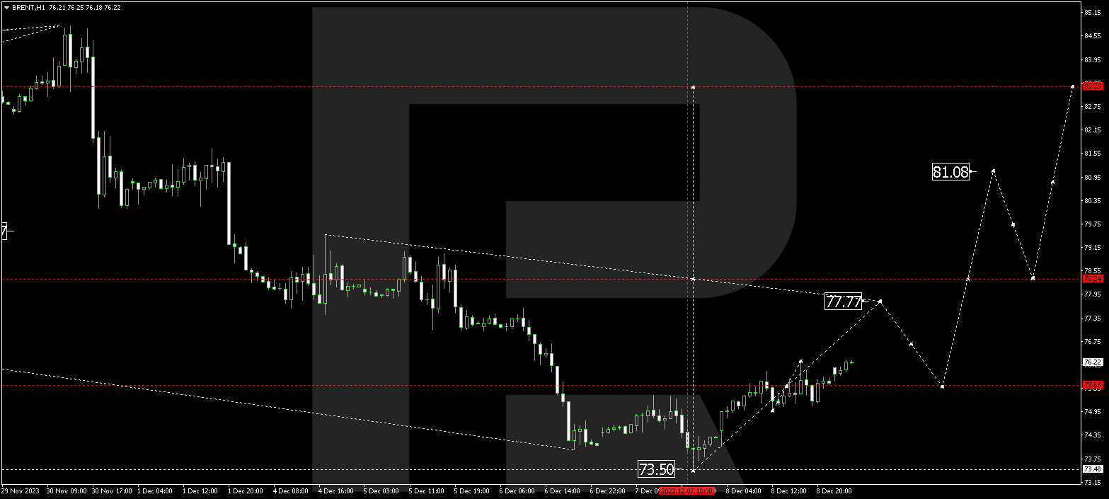 Brent is forming a growth wave to 77.77. Upon reaching this level, a correction link to 75.65 could form, followed by a growth wave to 81.07, from where the trend might continue to 83.25. This is the first target.