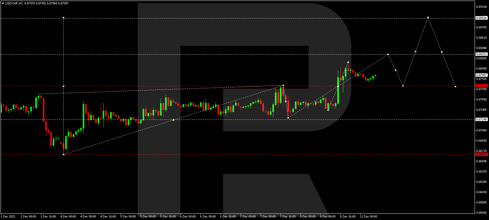 USD/CHF has completed a rise impulse to 0.8819. Today the pair could correct to 0.8780. After the correction is over, a new growth wave to 0.8833 might start, from where the trend could continue to 0.8899.