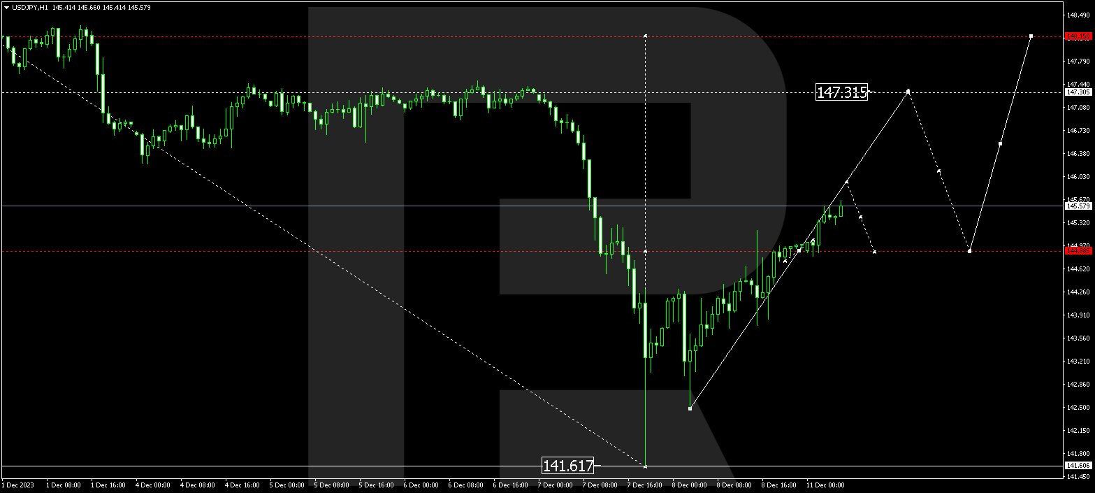 USD/JPY has completed a growth structure to 144.88. A structure of a consolidation range has formed today around this level. With an escape from the range upwards, the potential for a wave to 147.31 might open. This is a local target. Next, a decline to 144.88 might happen (a test from above), followed by a rise to 148.15. This is the first target.