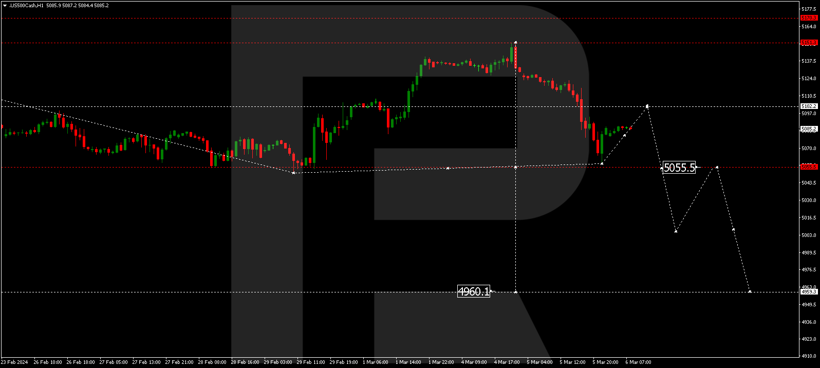 The stock index has completed a decline wave to 5058.0. Today a correction towards 5102.0 (testing from below) could develop. Practically, a wide consolidation range is forming around this level, which could expand to 5170.0. A downward breakout of this range will open the potential for a decline to 4959.0. This is the first target.