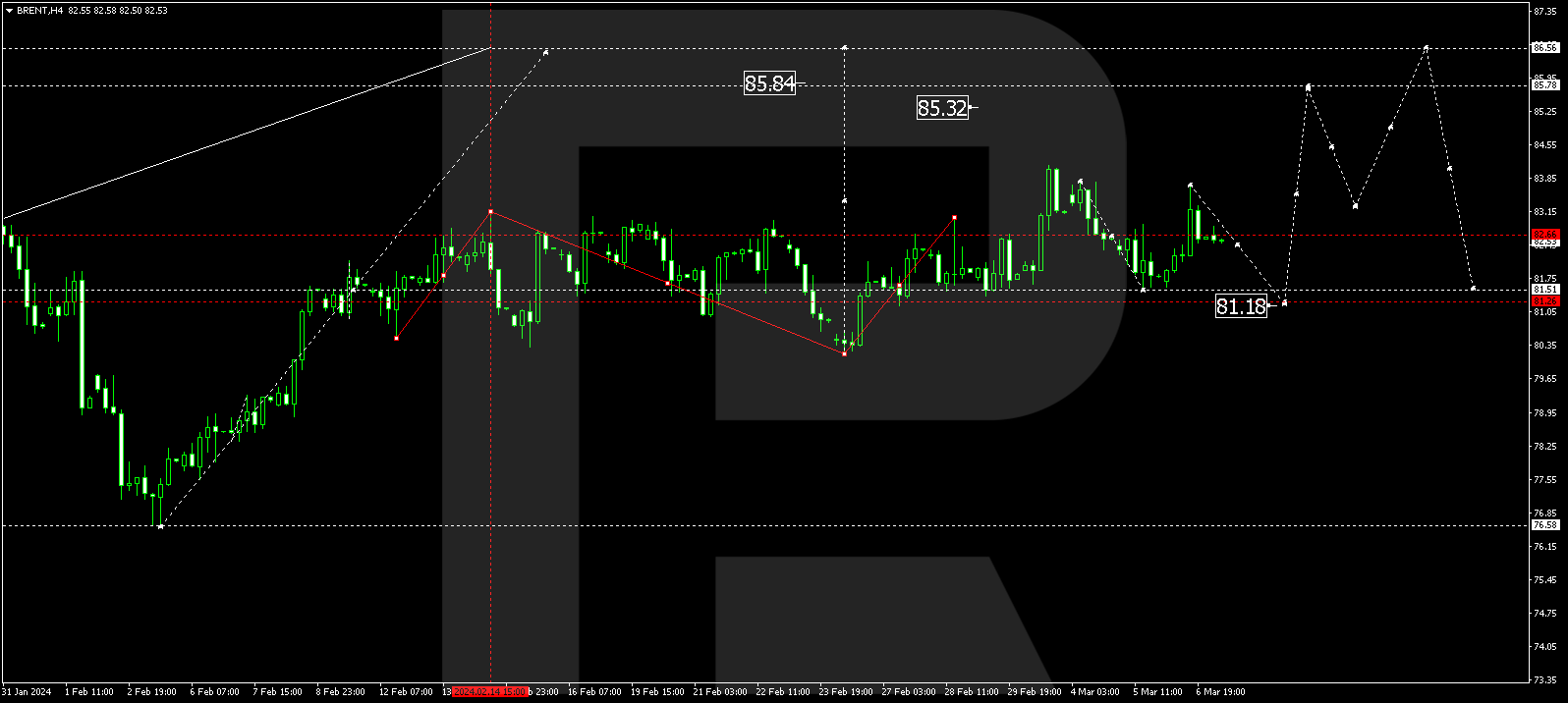 Brent has completed a growth link to 83.71. Further correction to 81.81 is expected today. Once this correction is over, a new growth wave to 85.85 might begin, from where the trend could continue to 86.60. This is the first target.
