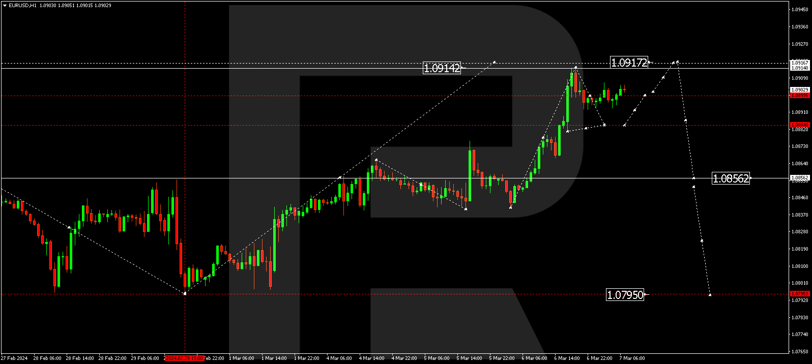 The EUR/USD pair has completed a growth wave to 1.0914. A consolidation range is expected to form around the 1.0899 level today. With a downward escape from the range, a correction structure could target 1.0884 (testing from above). When the correction is over, a growth structure to 1.0919 is not excluded. Next, a decline wave to 1.0858 is expected, from where the trend might extend to 1.0795. This is the first target.