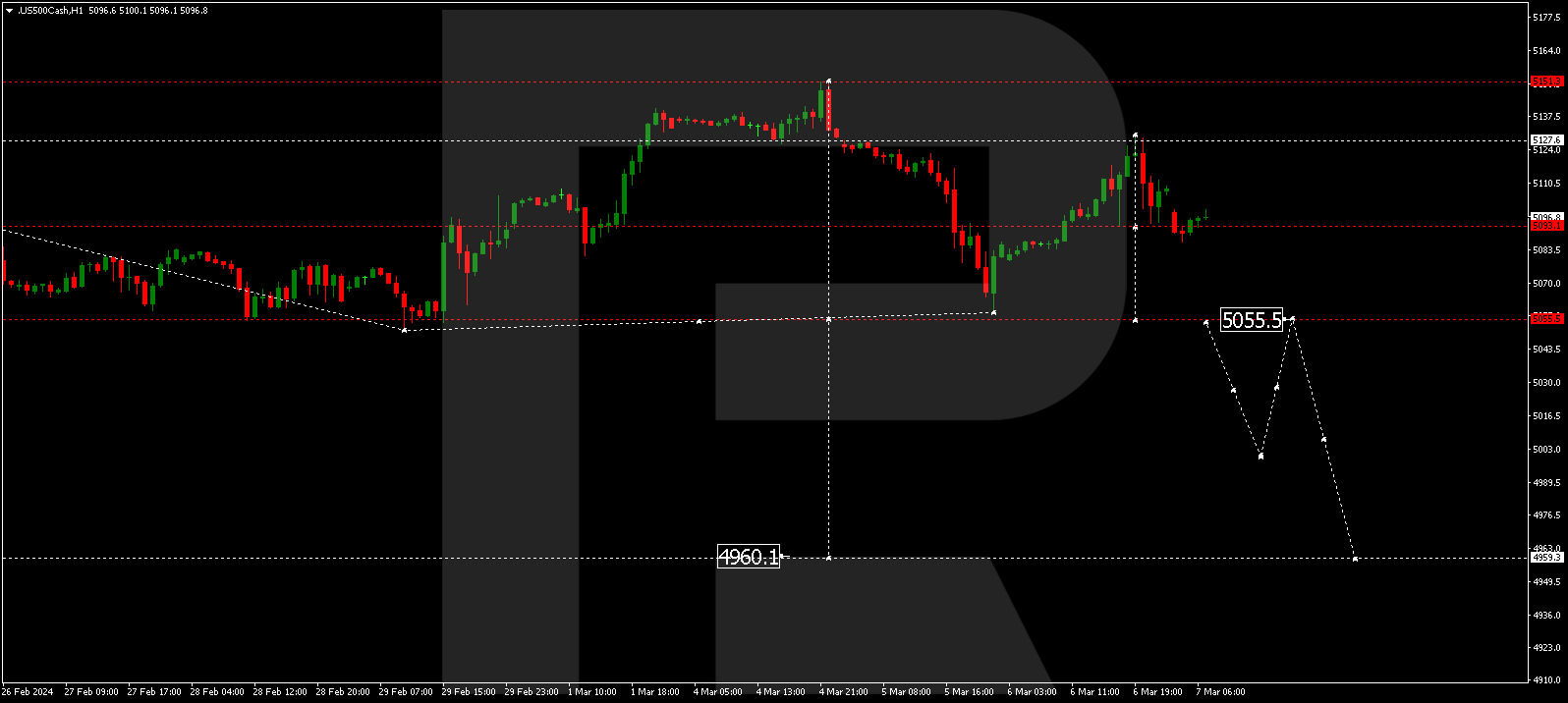 The stock index has completed a correction to 5127.7 and a decline impulse to 5093.0. A consolidation range is expected to develop around this level. With a downward escape from the range, the potential for a wave to 5050.5 might open. This is a local target. Once this level is reached, a correction link to 5090.0 is expected, followed by a decline to 4959.0. This is the first target.
