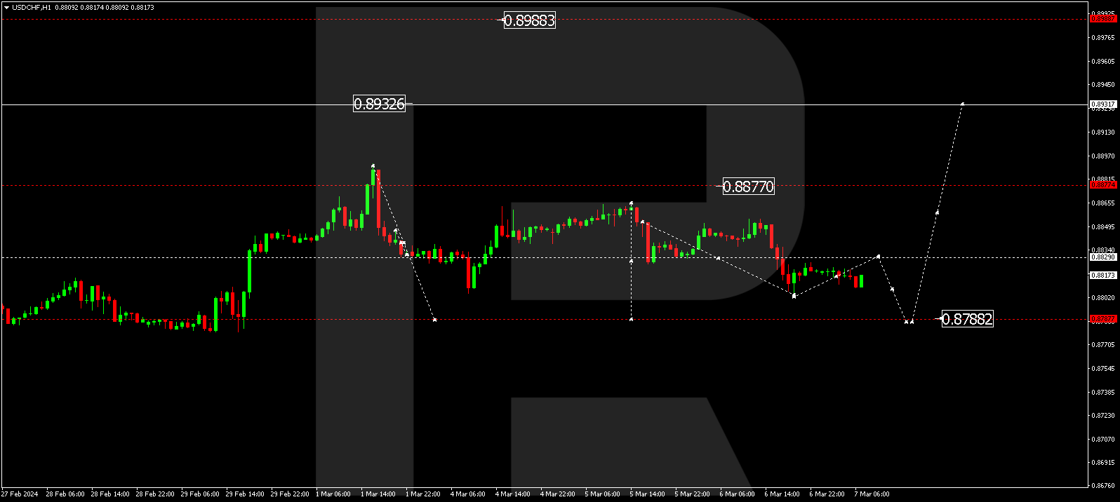 The USD/CHF pair continues developing a consolidation range around 0.8838, and today the market has expanded it downwards to 0.8804. A growth link to 0.8838 (testing from below) is not excluded, followed by a decline link to 0.8787. Next, a growth wave to 0.8930 could start. This is the first target.