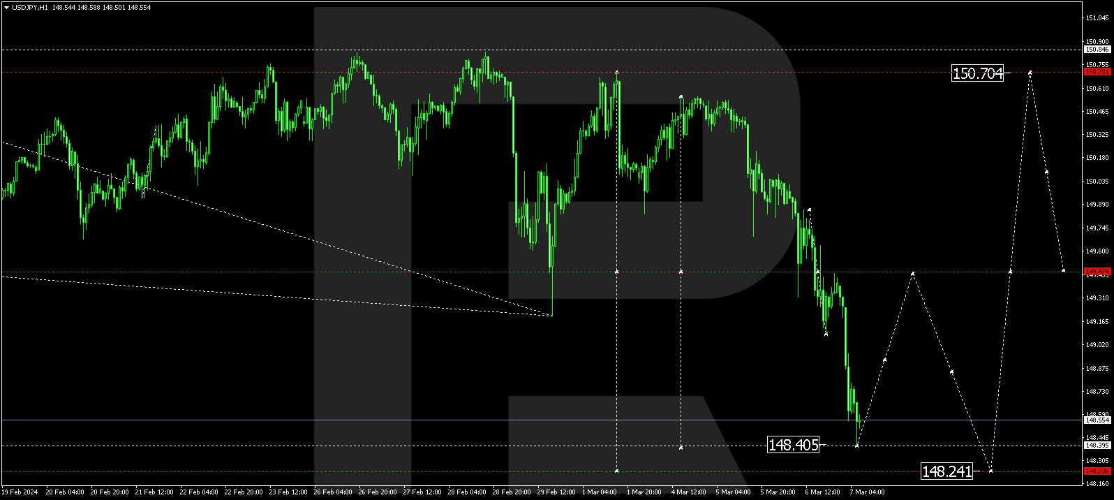The USD/JPY pair formed a consolidation range around 149.47. With a downward escape from the range today, the market extended the growth wave to 148.40. Currently, a new consolidation range is forming above this level. An upward escape from the range and a growth link towards 149.47 (testing from below) is expected. Next, a new correction link to 148.24 might form.