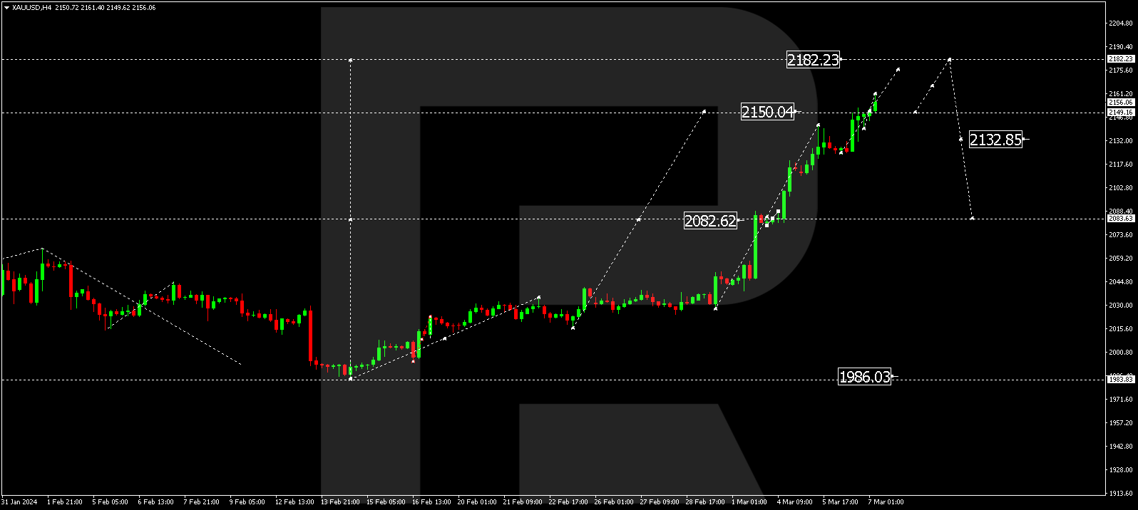 Gold has completed a growth wave to 2150.00. Today the market is forming a consolidation range around this level. With an upward escape from the range, the wave might extend to 2182.00. With a downward escape, the potential for a correction to 2083.63 could open. Once the correction is over, the trend might extend to 2196.00. This is a local target.