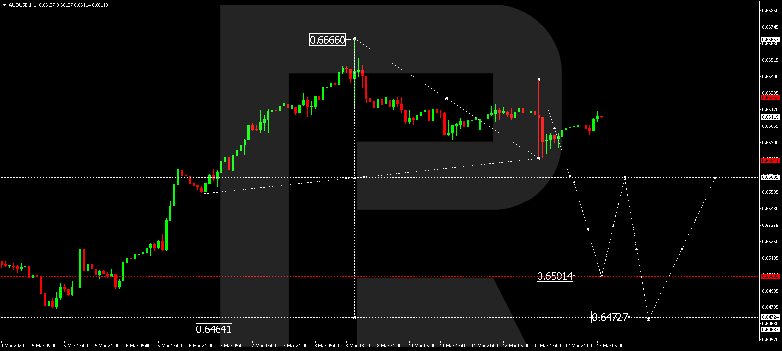 The AUD/USD pair has completed a decline wave to 0.6530. A correction structure to 0.6625 is forming today. Once this level is reached, a decline wave to 0.6570 might start, from which level the trend could extend to 0.6500. This is a local target.