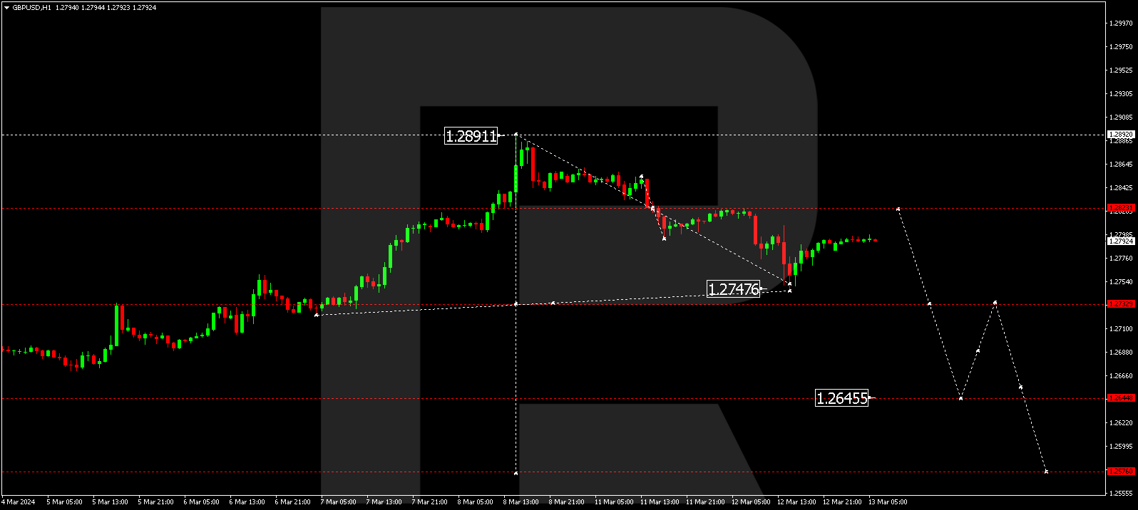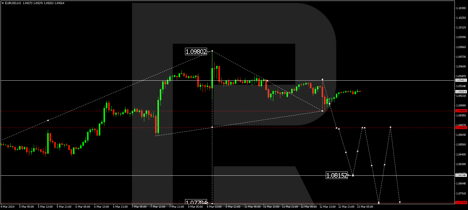 The EUR/USD pair completed a decline wave to 1.0900 and corrected to 1.0941. Practically, the market set the frames for a consolidation range. A decline link to 1.0878 is expected today. If this level breaks, the trend might extend to 1.0815, from which level a wave structure could reach 1.0778. This is the first target.