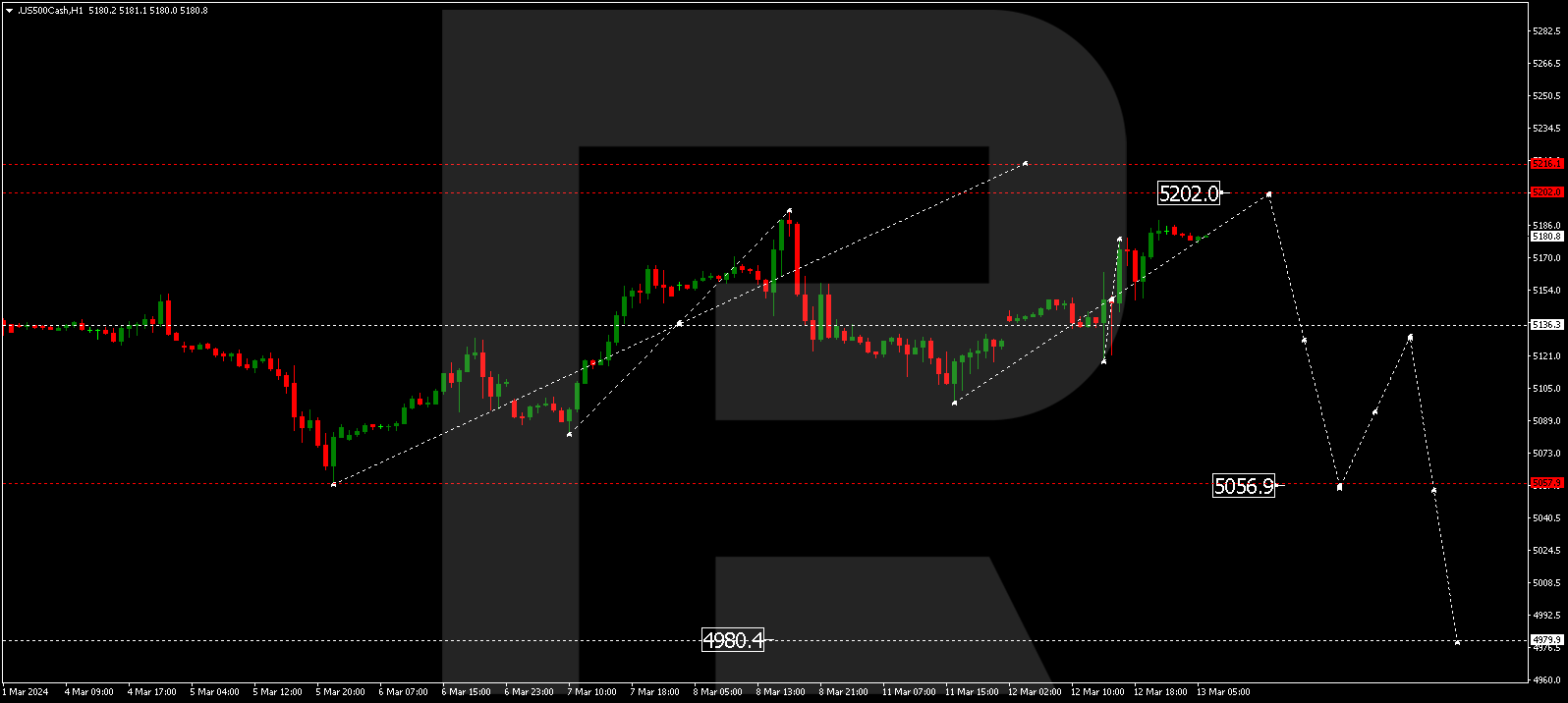 The stock index continues developing a consolidation range around 5136.0. Today the range could expand to 5202.0. Once this level is reached, a decline wave to 5057.0 could begin, from which level a growth link to 5136.0 might form (testing from below).