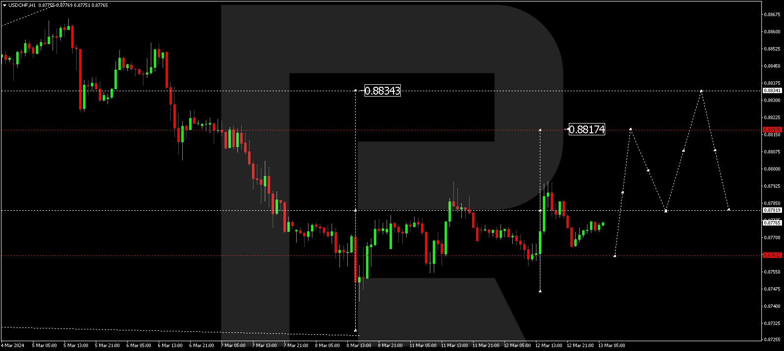 The USD/CHF pair is forming a consolidation range around 0.8781. With an upward escape from the range, the growth wave might extend to 0.8818, from which level the trend could continue to 0.8834. This is the first target.