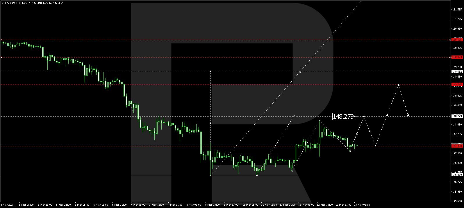 The USD/JPY pair performed a growth wave to 148.15 and corrected to 147.36. A growth link towards 148.30 is expected today. This is the first target. Once this level is reached, a correction link to 147.40 is not excluded, and when it is over, a growth wave to 149.24 might begin. This is a local target.