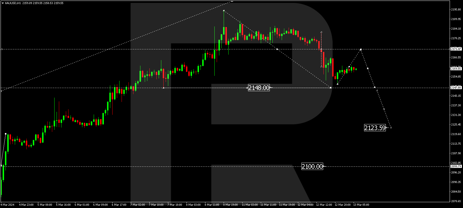 Gold has formed a consolidation range around 2171.50 and, escaping in downwards, extends the wave towards 2147.88. Once this level is reached, a correction link to 2170.00 is not excluded. Next, a decline wave to 2123.60 could begin. This is a local target.