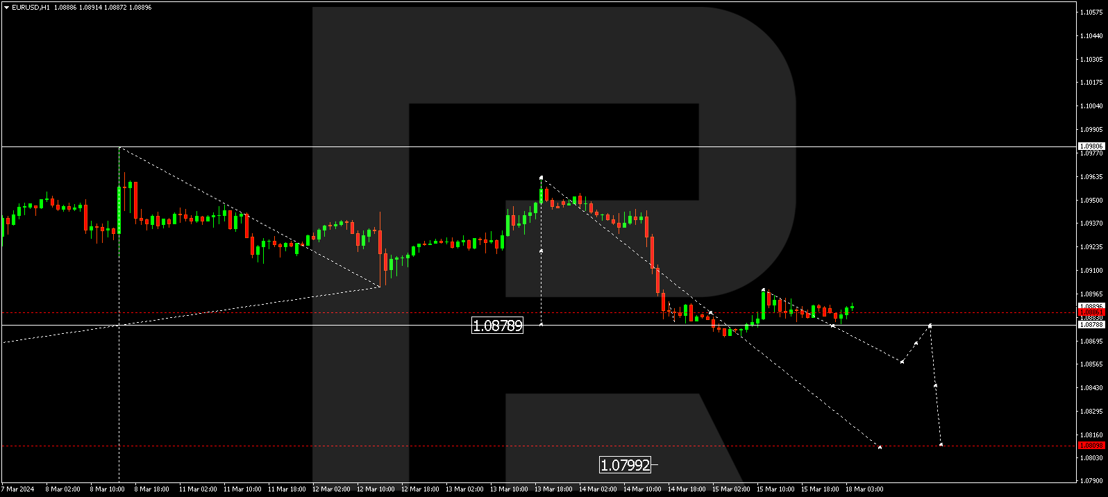 The EUR/USD pair continues developing a consolidation range around 1.0880. Today it is expected to extend to 1.0865. Next, a growth link to 1.0880 might form (testing from below), followed by a decline to 1.0808, from which level the wave could continue to 1.0799. The estimated target is a local one.
