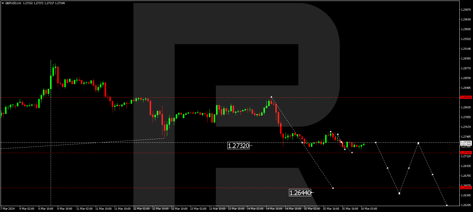 The GBP/USD pair continues developing a consolidation range around 1.2737. Today the range could expand to 1.2717. Next, a growth link to 1.2737 could form (testing from below), followed by a decline to 1.2653, from which level the wave might extend to 1.2644. This is a local target.