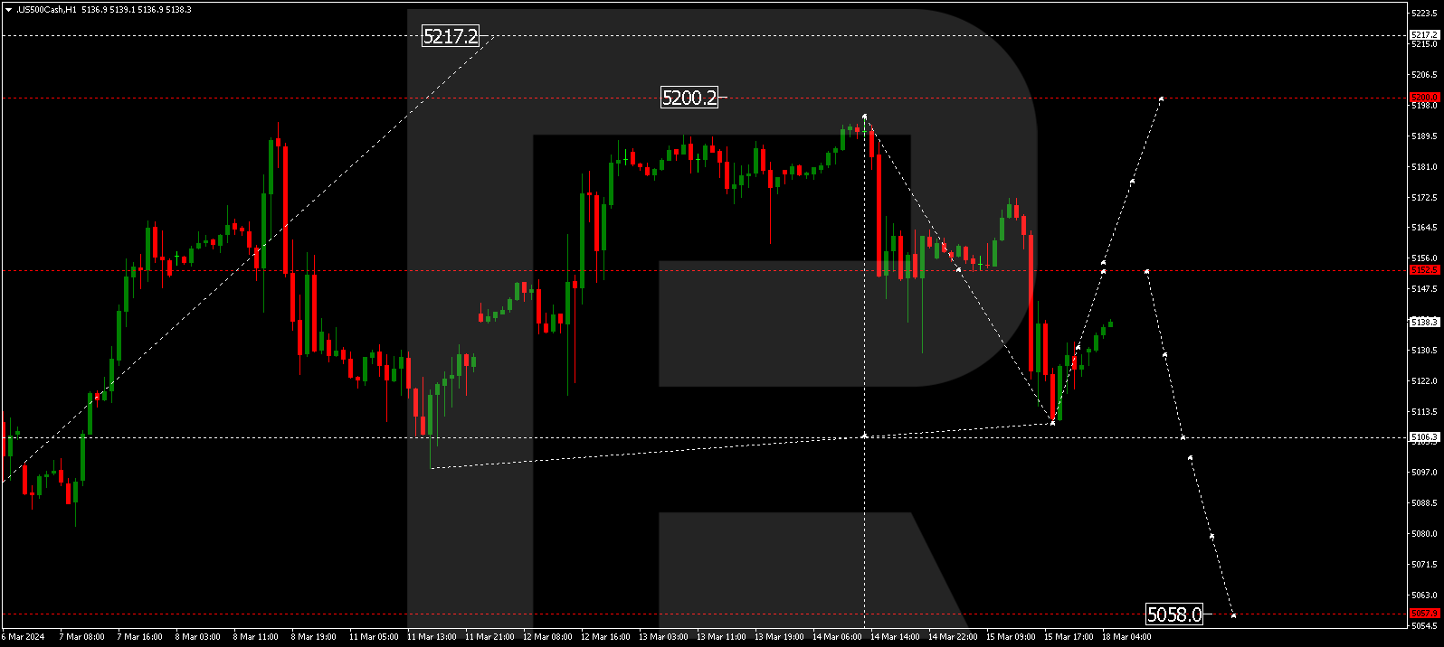 The stock index has formed a decline wave to 5110.0. A correction to 5152.0 could follow today (testing from below). Practically, a wide consolidation range might form around this level. Breaking this range downwards, the potential for a wave to 5058.0 might open. With an upward escape from the range, wave extension to 5200.0 is not excluded, followed by a decline to 5058.0. This is a local target.