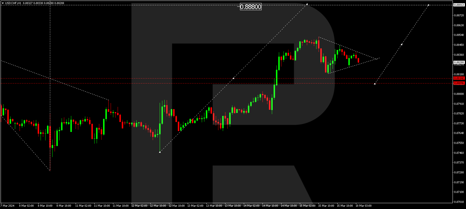 The USD/CHF pair continues forming a consolidation range under 0.8852. A correction link to 0.8808 is not excluded today. Once the correction is over, a new wave to 0.8882 might start. This is a local target.
