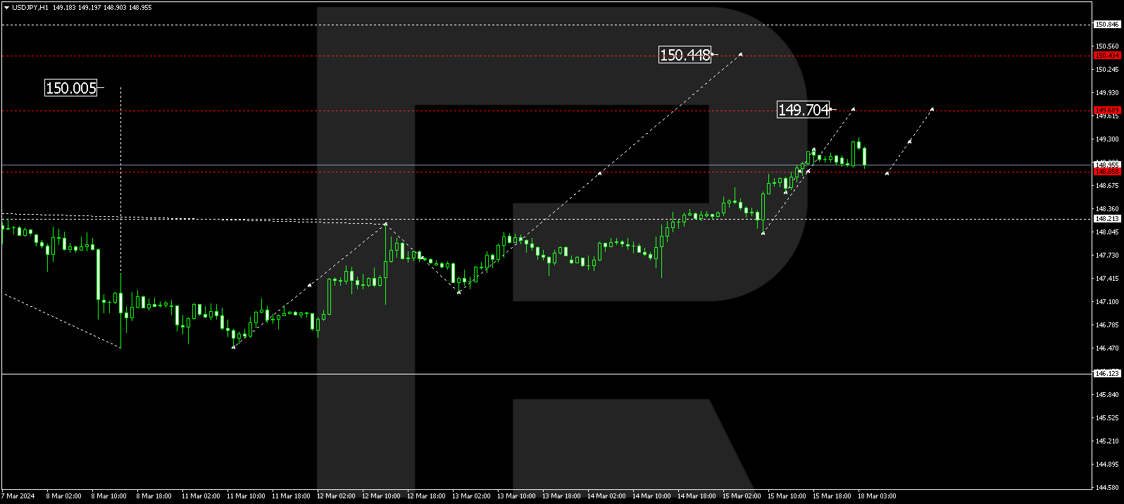 The USD/JPY pair continues developing a consolidation range around the 148.85 level. Today the growth wave is expected to continue to 149.70, from which level the trend could extend to 150.00. This is a local target.