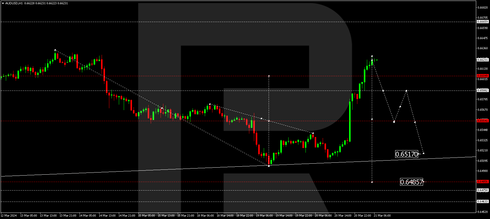 The AUD/USD pair gained support at 0.6512 from the news and started developing a correction. Today the quotes might reach 0.6634. Next, a decline link to 0.6575 and a correction to 0.6640 could follow. Once this correction is over, a new decline link to 0.6474 might begin. This is the first target.
