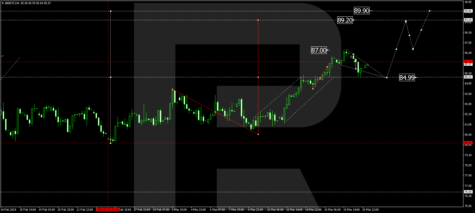 Brent has completed a correction wave to 85.00. Today the quotes might rise to 87.00. If this level also breaks, the potential for a wave towards 89.20 could open, from which level the trend might extend to 89.90. This is the first target.