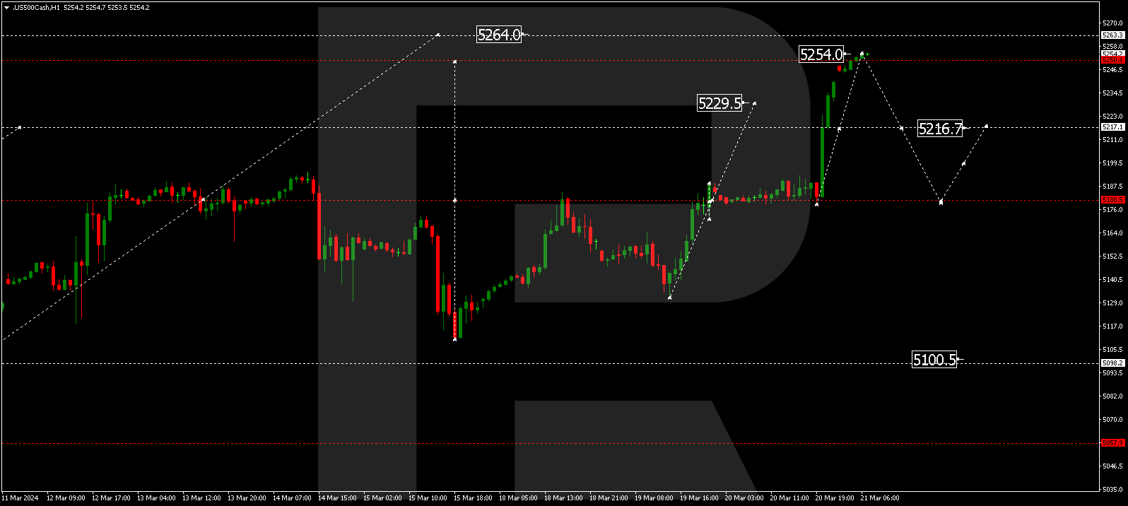 The stock index, supported by the news, has broken a consolidation range upwards and suggests extending the growth wave to 5260.0. Once this level is reached, a decline to 5185.0 is expected. Next, a rise to 5272.0 could follow. After reaching this level, the quotes might start a new decline wave to 5185.0.