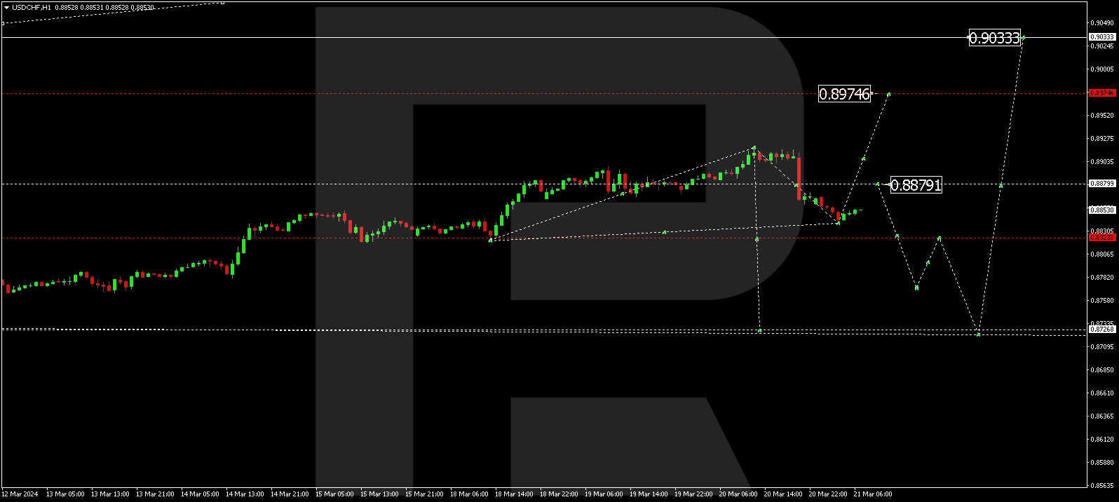 The USD/CHF pair has corrected towards 0.8838. The correction might extend to 0.8833 (testing from above). Once this correction is over, a new growth wave to 0.8920 could start. And if this level also breaks, the potential for a wave towards 0.8975 might open. This is the first target.