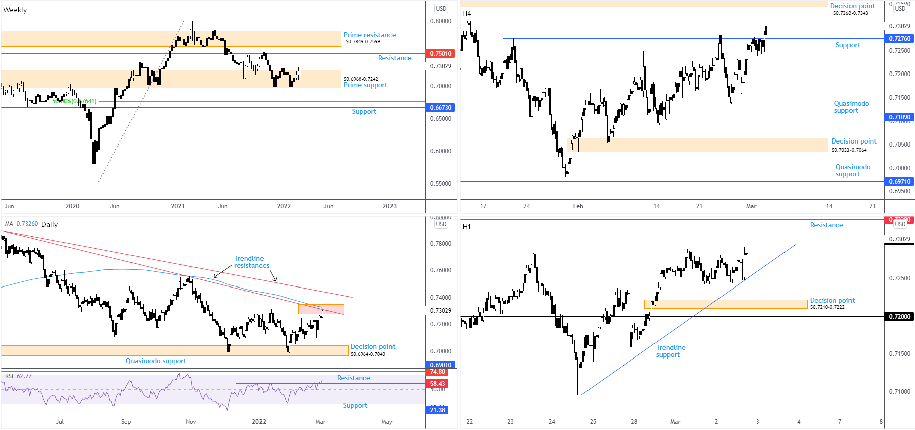From the H4 timeframe, AUD/USD bulls stepped over resistance at $0.7276 (now support) on Wednesday and directed focus towards a decision point from $0.7368-0.7343. Alongside this, the H1 timeframe has price action attempting to muscle its way above $0.73, which could set the technical stage for an approach to resistance at $0.7329.