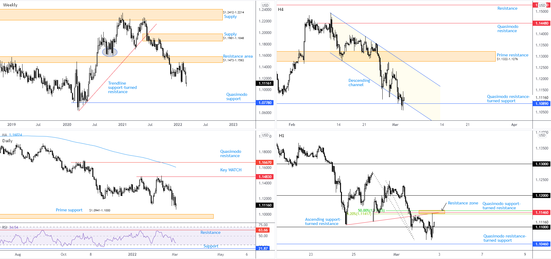 Focus is centred on $1.11 and H1 resistance from $1.1153-1.1142. Should H1 hold above $1.11 but fail to overthrow the noted resistance area, this suggests bullish forces from H4 support around $1.1089 are perhaps unstable. This is in line with higher timeframe studies; therefore, a bearish scenario could unfold at $1.1153-1.1142. Climbing above the latter, on the other hand, signals a deeper pullback to $1.12 and may be viewed as a bullish breakout scene north of H1 resistance to the said round number.