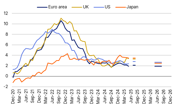 Straight lines on graphic designate Scope forecasting for calendar-year average inflation in 2025 and 2026. Source: National/regional statistics bodies, Scope Ratings forecasts.