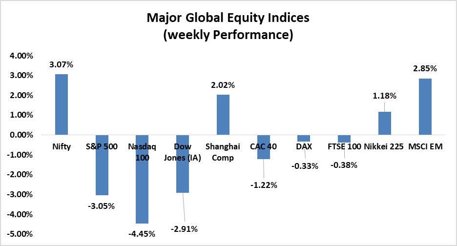 Indian indices bounced back in style from the previous slumps in the last session of the week as both the Sensex and Nifty advanced close to 3%, tracking positive trends from Asian peers. Asian investors reacted positively to the Chinese central bank's decision to reduce its rate on a five-year loan, which would shore up weak housing sales by cutting mortgage costs. On a weekly basis, Nifty Metal and Nifty Auto were the biggest gainers whereas Nifty IT was the only loser. With concerns over an economic slowdown and rate hikes across the globe, investors will continue to invest with caution.