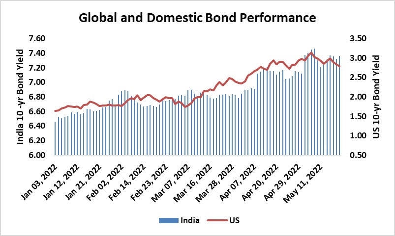 Indian government bonds have experienced much turbulence over the last couple of weeks, see-sawing between considerable gains and losses as traders have reacted to a wide range of contrasting developments. The elevated inflation, surging crude prices, and other global cues kept the domestic bond market under pressure during the week. India's 10-year benchmark closed the week at 7.359%. One of the members of India's rate-setting Monetary Policy Committee stated that there is a need to front-load rate hikes as higher long-term yields can affect private Capex spending.