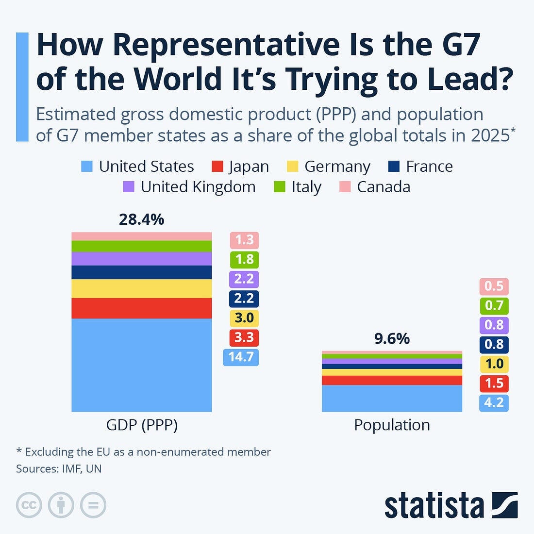 But as Statista’s Felix Richter lays out, the G7’s claim to global leadership is starting to look more like nostalgia than necessity. The group may still drive headlines, but it’s no longer the majority shareholder in global output. Back in the day, G7 nations commanded over 50% of global GDP (at PPP). Today? Just 28%. In population terms, the bloc represents less than 10% of the planet’s people. That’s not leadership—that’s legacy.