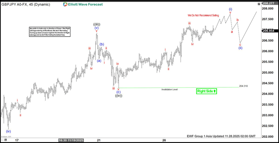 The short-term Elliott Wave outlook in GBPJPY indicates that the cycle from the October 2, 2025 low remains in progress as a five-wave diagonal structure. From that date, wave ((i)) concluded at 205.3, followed by a corrective pullback in wave ((ii)) that reached 199.05. The pair then advanced in wave ((iii)), achieving 206.85, as reflected in the 45‑minute chart. Subsequently, wave ((iv)) unfolded in the form of a zigzag pattern. Within this correction, wave (a) ended at 205.63, wave (b) terminated at 206.21, and wave (c) completed at 204.31. This final leg also marked the completion of wave ((iv)) at a higher degree.