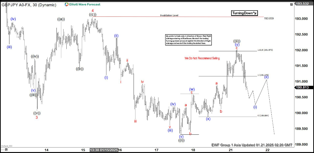 Short term Elliott Wave view in GBP/JPY shows the decline from 12.30.2024 high is in progress as a 5 waves impulse. Down from 12.30.2024 high, wave 1 ended at 195.72 and wave 2 rally ended at 198.25. Pair has resumed lower in wave 3 towards 190.06 as the 30 minutes chart below shows. Wave 4 unfolded as a zigzag Elliott Wave structure. Up from wave 3, wave ((a)) ended at 192.91, wave ((b)) ended at 191.46 and wave ((c)) ended at 193.05. This completed wave 4 in higher degree.