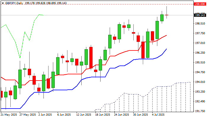 GBPJPY edged lower from new one-year high, as larger bulls started to lose traction on approach to psychological 200.00 barrier.