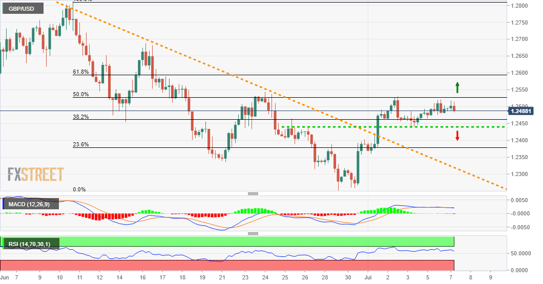 From the US, the ISM Non-Manufacturing PMI surpassed even the most optimistic estimates and jumped to 57.1 in June from 45.4 previous. This coupled with worries over the second wave of coronavirus infections provided some respite to the USD bulls. The market concerns that the recent sharp rise in COVID-19 cases might trigger renewed lockdown measures and that the current economic recovery may prove to be short-lived revived demand for traditional safe-haven assets, including the USD. This comes amid persistent Brexit-related uncertainties, which held investors from placing any aggressive bullish bets around the sterling.