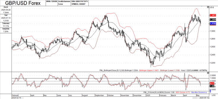 This chart shows a more recent timeframe with Bollinger Bands. The price action shows volatility, with swings both up and down. The overall trend appears upward, with the price generally trending higher over this period. The price has recently broken above the upper Bollinger Band, which can signal a strong uptrend but also a potential overbought condition. The Bollinger Bands provide dynamic support and resistance levels. The middle band often acts as a dynamic support/resistance. The chart indicates Bollinger High (1.3421), Bollinger Low (1.3185), and Bollinger Open (1.3014).