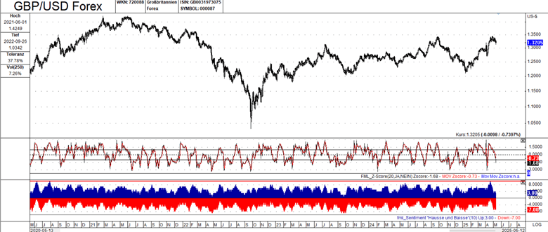 This chart presents the longest timeframe of the three analyzed. It shows a significant downtrend from mid-2021 to late 2022. The price has been recovering since late 2022, with an overall upward trajectory. The high is marked at 1.4249, and the chart shows the current price around 1.3285. The middle pane displays a Z-Score oscillator. The lower pane shows a sentiment indicator. The sentiment indicator shows a shift from bearish sentiment during the downtrend to more balanced and then bullish sentiment during the recovery.