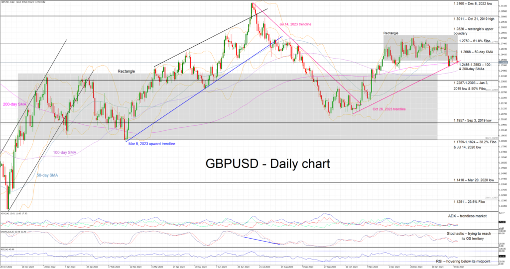Should the bears stay determined, they could try to push GBP/USD below both the October 26, 2023 trendline and the 1.2486-1.2553 range that is populated by the 100- and 200-day SMAs. Lower, the busy 1.2287-1.2393 area, which is defined by the January 3, 2019 low and the 50% Fibonacci retracement of the June 1, 2021 – September 26, 2022 downtrend, will probably prove stronger to overcome than currently envisaged.