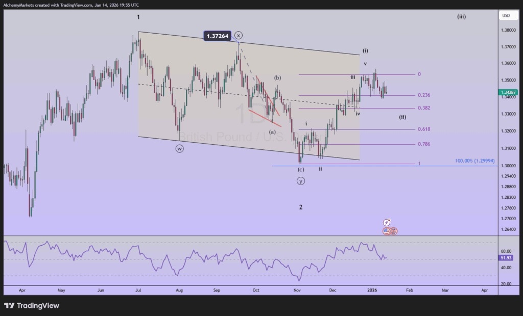 Then, once wave (ii) is in place, GBP/USD would need to break above the price channel resistance near 1.3650.